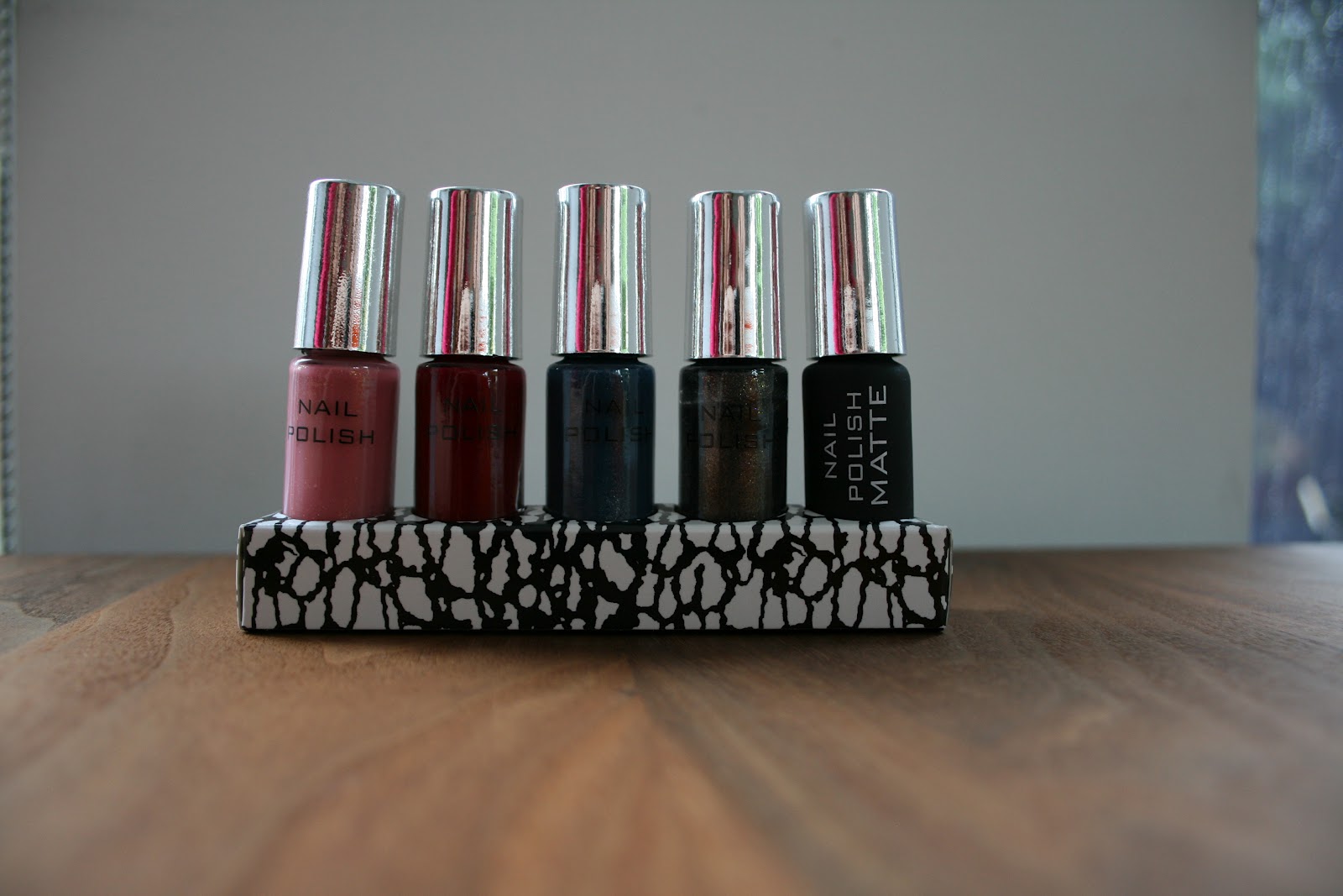 I bought this set of nail polishes the same day as I bought the H&M sweater. Whenever I see these sets of nail polishes at H&M, I just can't help but buy them. I think these small bottles of nail polish are really cute, and very often there are very special colours in it, or colours you don't need often but you'd still like to have in your stash. In this one there's a Red, blue and pink one, plus a black one with golden glitters and a matte top coat - something I've wanted to try for a long time. By the way, these H&M polishes take a long time to dry, I think. It seems like they're dry, but they're still really 'creamy' from the inside, so be careful.